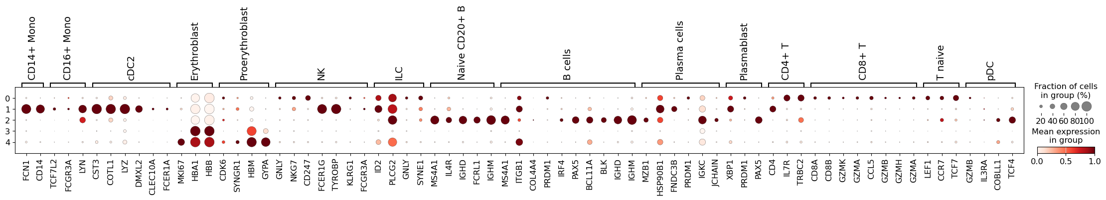 sc.pl.rank_genes_groups_dotplot(adata, groupby="leiden_res_0.50", standard_scale="var", n_genes=5)