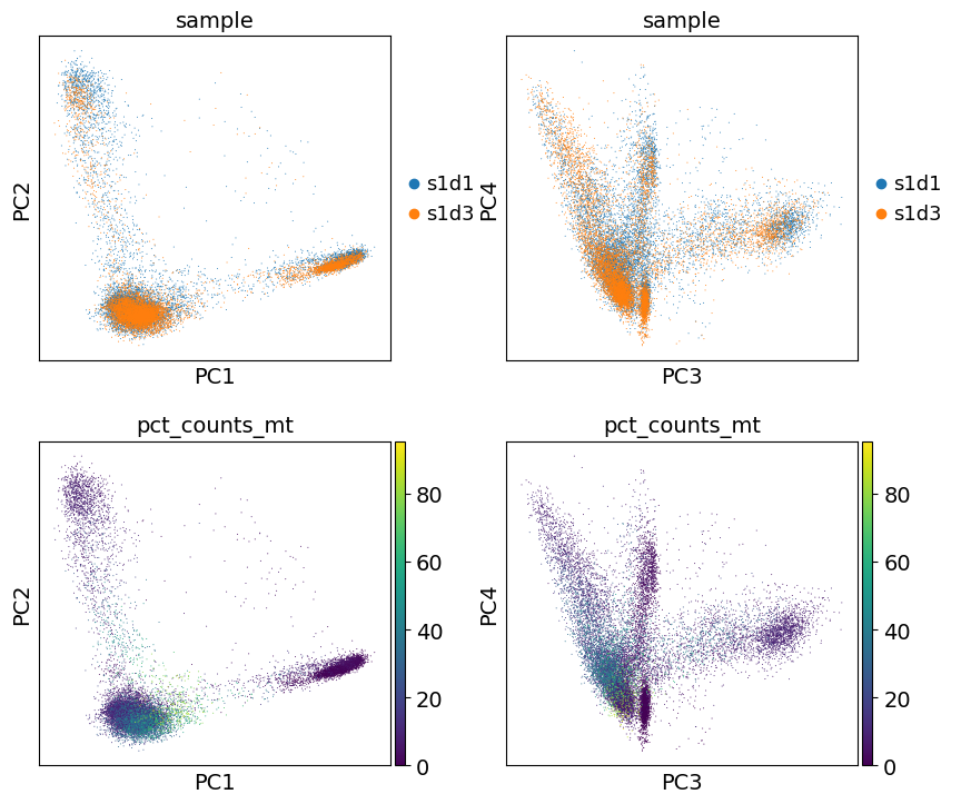 You can also plot the principal components to see if there are any potentially undesired features (e.g. batch, QC metrics) driving signifigant variation in this dataset. In this case, there isn’t anything too alarming, but it’s a good idea to explore this.