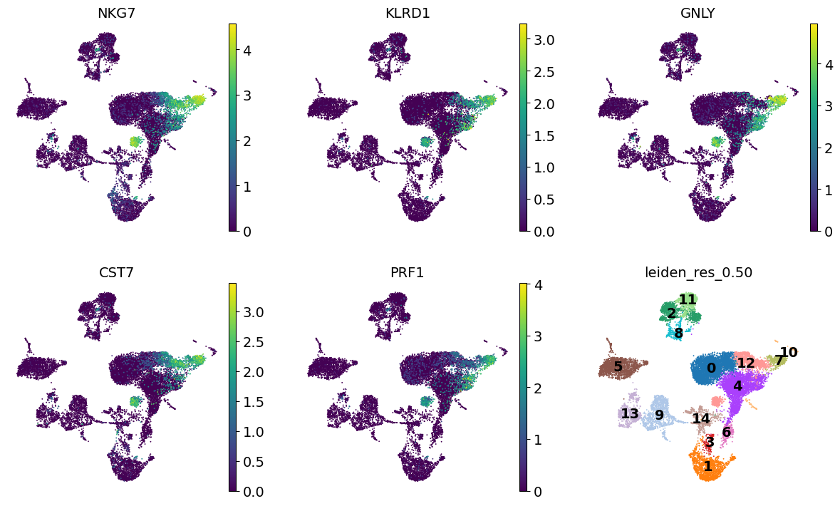 "NK": ["GNLY", "NKG7", "CD247", "FCER1G", "TYROBP", "KLRG1", "FCGR3A"],